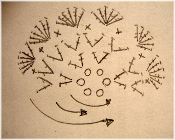 Las dos primeras vueltas tejidas en puntos altos y las ondas de la última en puntos dobles altos. (Al hacer tantos aumentos en los pétalos queda con forma ondulada, si la queremos más plana, aumentamos menos).