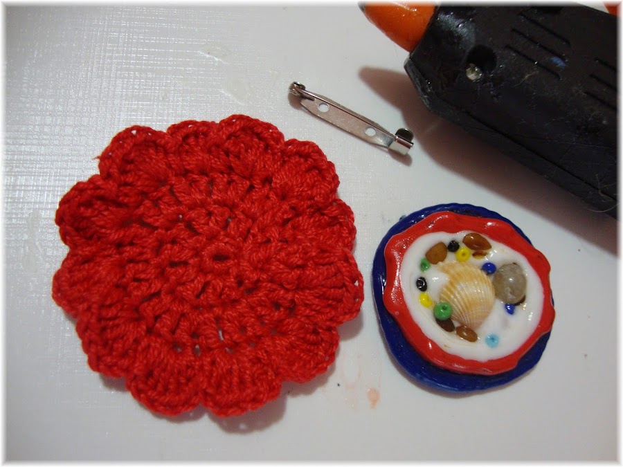 Con ayuda le la pistola de silicona caliente, fijamos la base de ganchillo a la de plástico y, por detrás hacemos lo mismo con el soporte metálico.