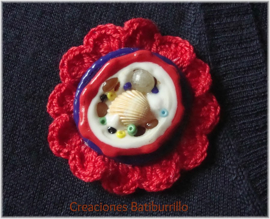 El centro es una fusión de 3 tapones concéntricos horneados, con una concha, pequeñas piedras y abalorios.