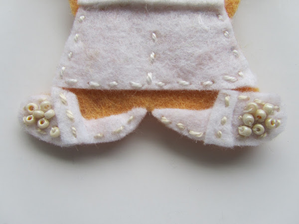 - Para hacer los rizos del pelo, he recortado circunferencias de fieltro que a su vez se recortan en forma de caracol, y las he cosido por el centro a la base del pelo.