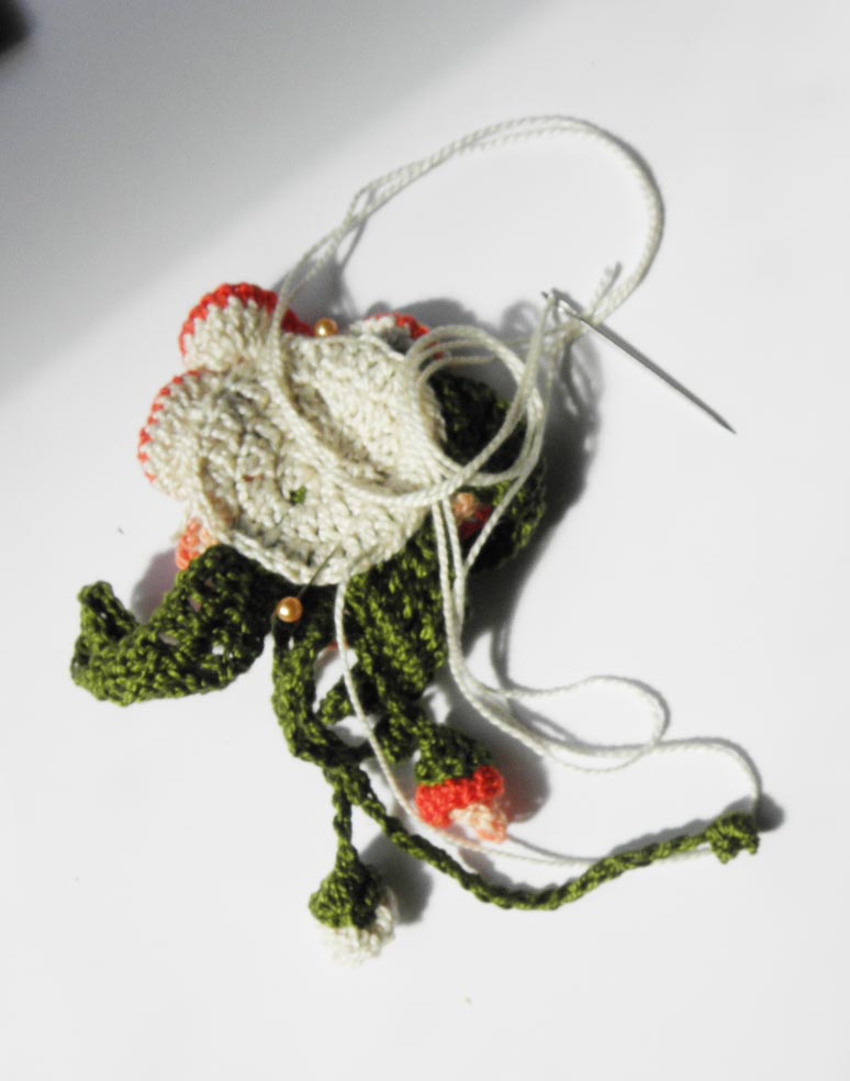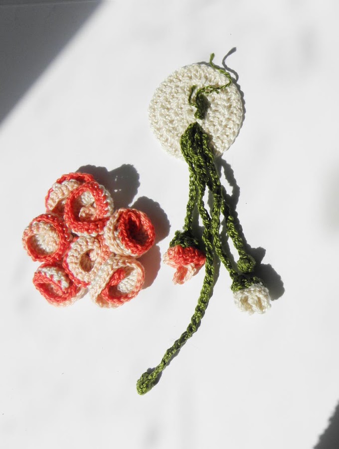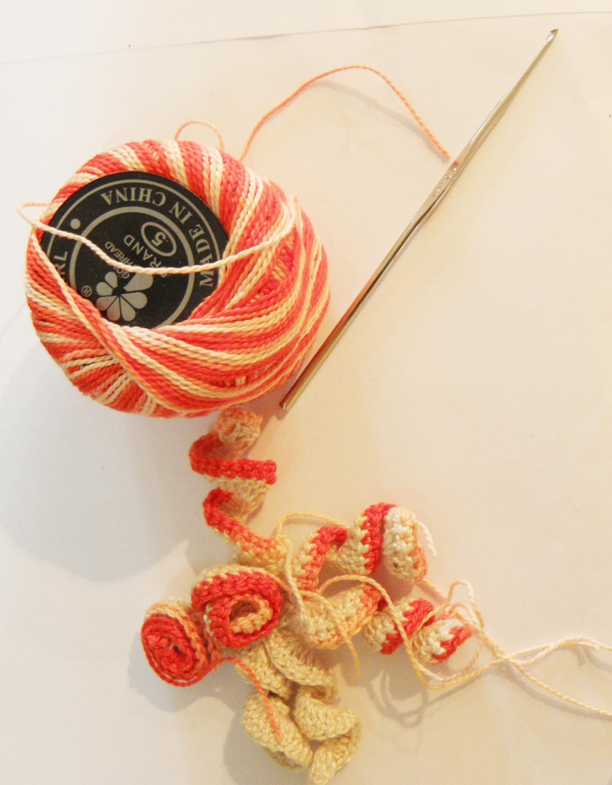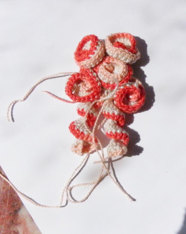 Rodear el "muelle" con hilo que haga un buen contraste a punto enano y la labor se enrolla ella solita y van surgiendo las flores.