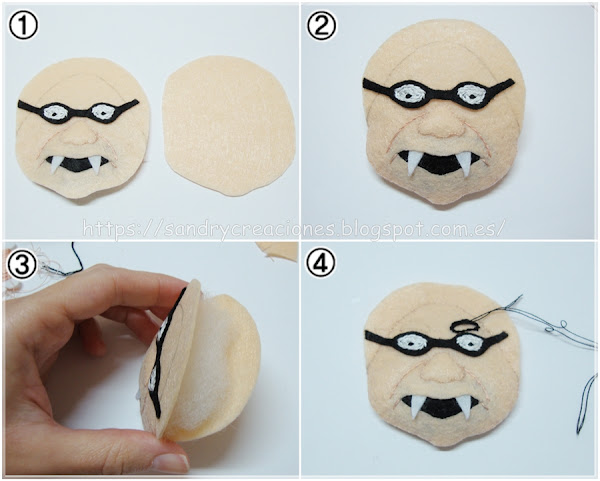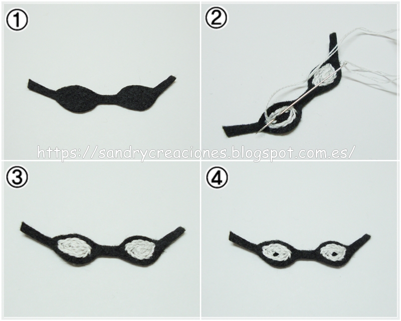 Para terminar los detalles de la cara de la bruja Avería ya solo nos falta realizarle las gafas que haremos con fieltro negro (imagen 1) y en las que le bordaremos los ojos (imágenes 2, 3 y 4). Una vez terminadas, las pegamos con pegamento textil en el lugar correspondiente de la cara según el patrón que hicimos al principio de la manualidad.