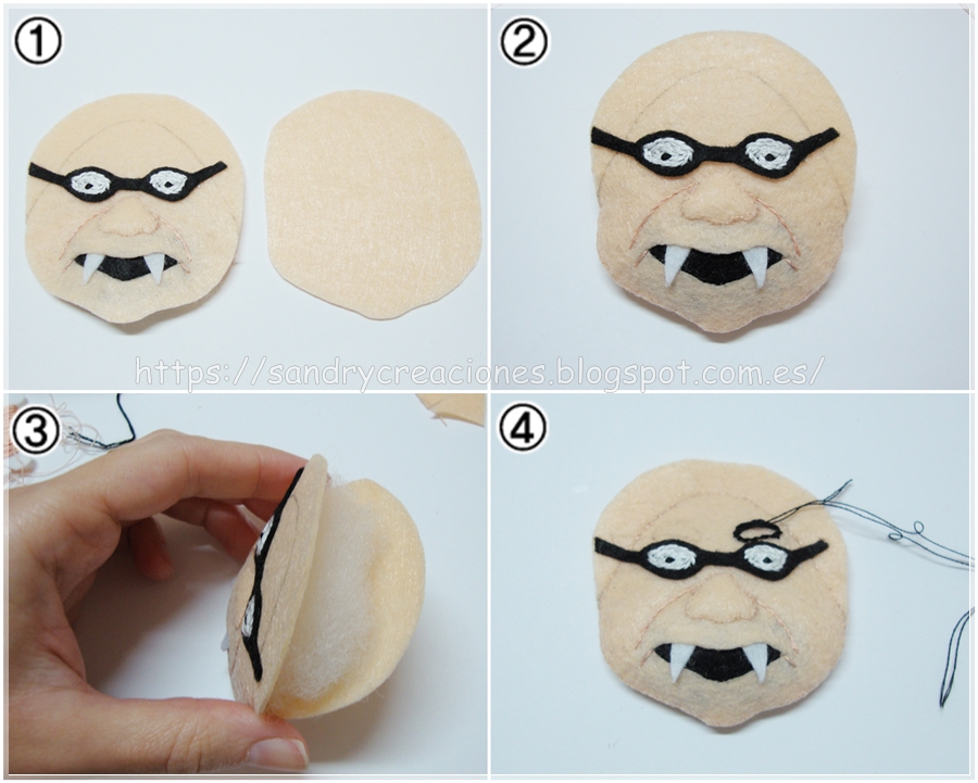 Una vez tenemos todos los detalles de la cara realizados cogemos la segunda pieza de la cara que habíamos hecho al principio (imagen 1) y la cosemos por detrás de la parte que hemos detallado (imagen 2) y si no os gusta coser también podéis hacerlo con pegamento textil o silicona caliente. Vamos cosiendo o pegando las dos partes dejando abierta la parte superior para introducir relleno para darle un poco de volumen a toda la cara y también para poder bordar las cejas antes de cerrarla del todo.