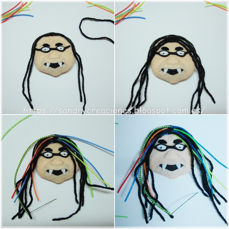Llegados a este punto ya solo nos queda una parte muy característica de esa bruja, confeccionar sus pelos que son como una mezcla de hilos y cables de muchos colores. Para hacerlos hemos utilizado lanas, hilos de scoubidou e hilos de crochet. Cortamos trozos más o menos de 10 cm y los vamos pegando a la parte superior de la cabeza con silicona caliente.