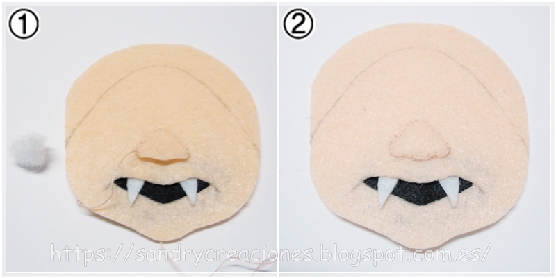 Una vez realizada la boca pasamos a fieltro el patrón de la nariz (imagen 1) y los cosemos con un punto de lado pequeñito a la cara (imagen 2) y antes de coserlo del todo le ponemos un poquito de relleno para darle un poquito de volumen.