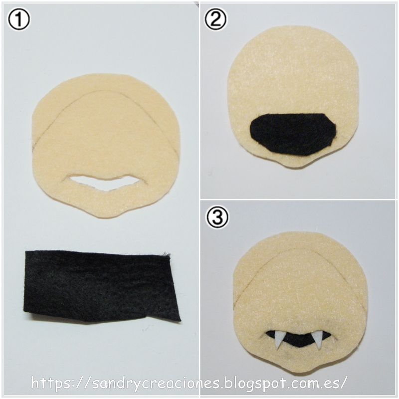 En este caso, a diferencia del broche de Ferdy, nos decidimos por no hacer la boca bordada ya que le queríamos dar un efecto de profundidad y que además al ponerle los dientes se vieran así como con volumen y con el bordado pensamos que quedaría todo demasiado igualado. Así que recortamos el agujero de la boca (imagen 1) y le pegamos con pegamento textil por la parte interior del patrón un trozo de fieltro negro que cubriera el agujero de la boca (imagen 2). Finalmente cortamos dos triangulitos pequeños de fieltro blanco y los pegamos con pegamento textil por la parte de delante de la boca (imagen 3).