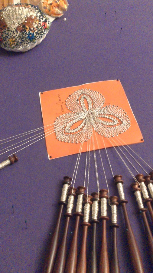 En estos días os mostré como estaba haciendo unas flores en bolillos para hacer un broche. En estas fotos podéis ver el picado puesto en la almohadilla con sus bolillos.