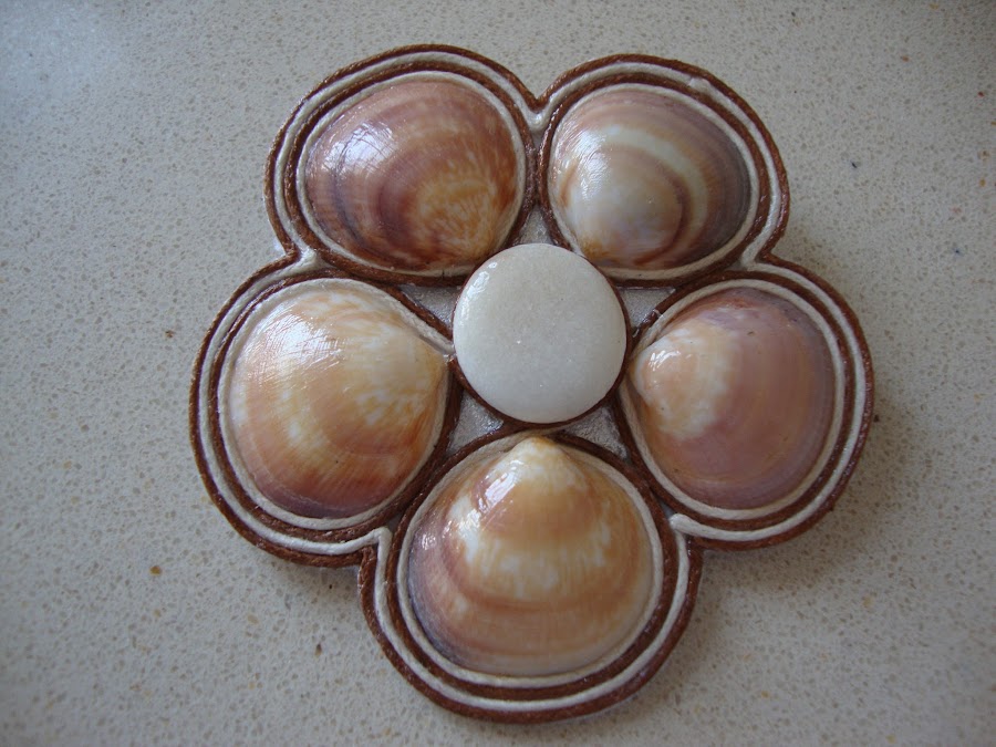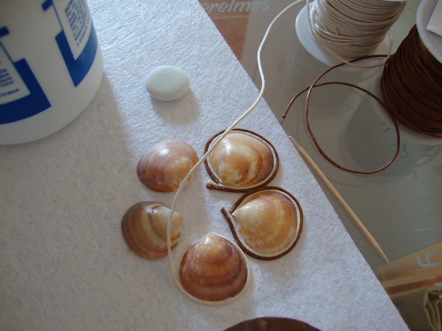 Se trabaja sobre fieltro. Pegando con cola blanca. Escogemos cinco conchas pequeñas que nos gusten y combinen en tamaños y colores y las colocamos formando un círculo y dejando un poco de espacio entre ellas porque después nos tiene que caber el adorno de cordón a su alrededor. Encolamos y dejamos secar.