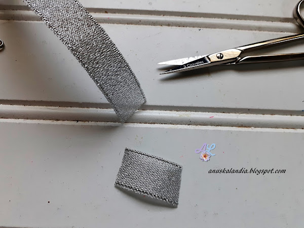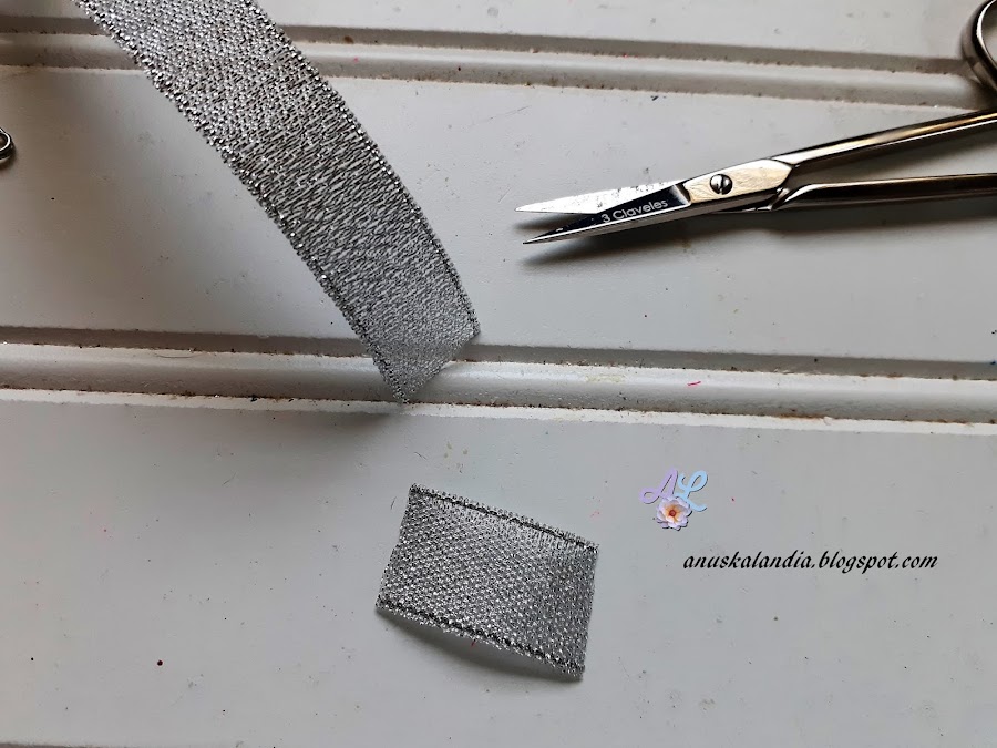 8.- Nos disponemos a preparar la parte final, que sería montar el broche. Cogemos un trocito de la cinta que utilizamos anteriormente, para forrar. Lo pegamos por la parte posterior, centrado y poniendo dos puntos de silicona. Lo dejaremos un poco hueco.