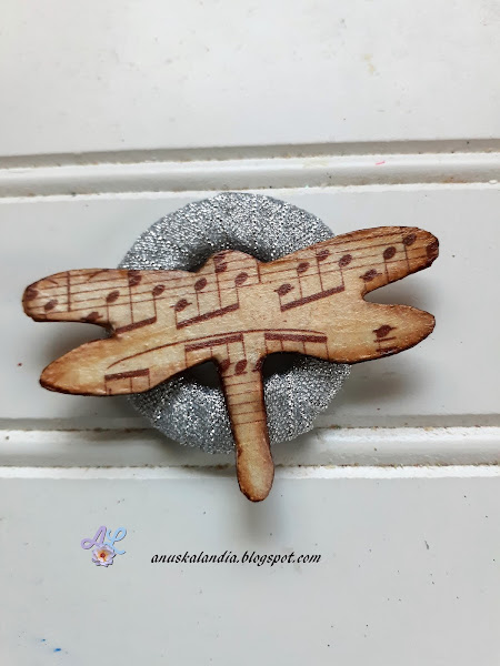 9.- Ponemos otros dos puntos de silicona en el círculo y pegamos la libélula. Enganchamos el imperdible.