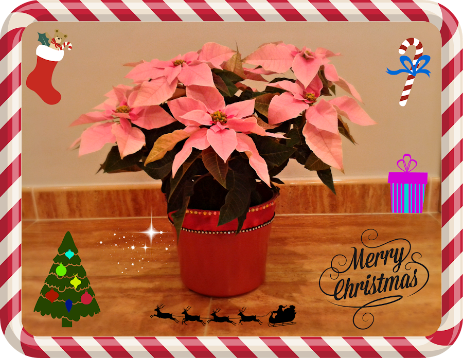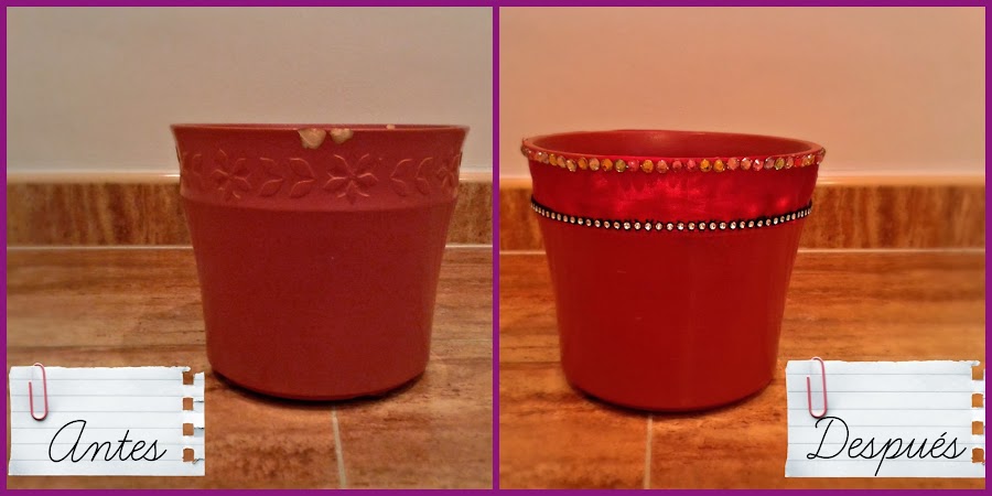 Otra cosa que he hecho estos días ha sido la siguiente: me compré una Flor de Pascua preciosa que vi en la tienda color rosa, y la quise poner enseguida adornando mi casa, el caso es que no tenía macetas bonitas en casa. Encontré una roja vieja y descascarillada, así que pensé que a lo mejor podría arreglarla con lo que tenía por casa, cogí un trozo de cinta de raso, un poco de tiras de strass y un poco de pegamento y me puse manos a la obra. Y así a quedado mi maceta "tuneada" para estas navidades: