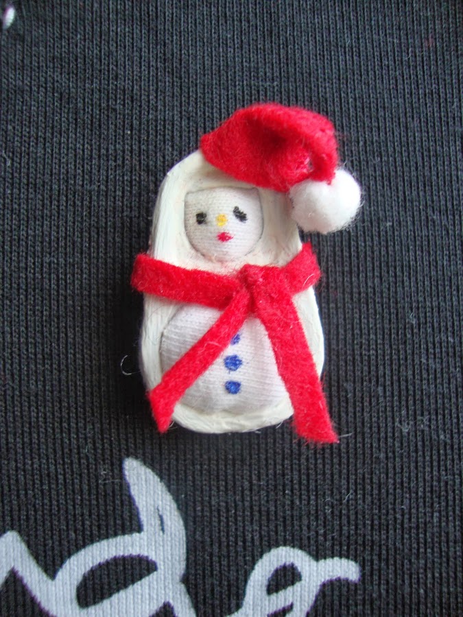 Un pequeño muñeco de nieve-Papá Noel hecho a partir de una anilla de lata de conserva.