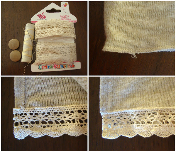 Para empezar, una puntilla de encaje cosida a mano en los bajos, dejando el borde a la vista. Y un botón en las mangas haciendo un pliegue para subirlas un poco de largo.