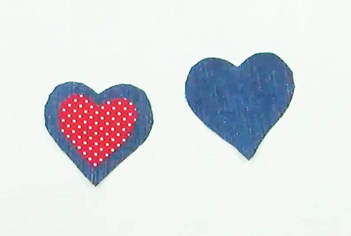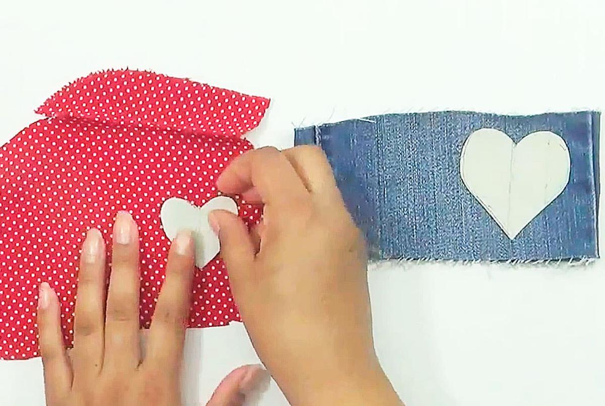 Marcar y cortar 2 corazones grandes en tela jeans y un corazón más pequeño de cualquier tela estampada.