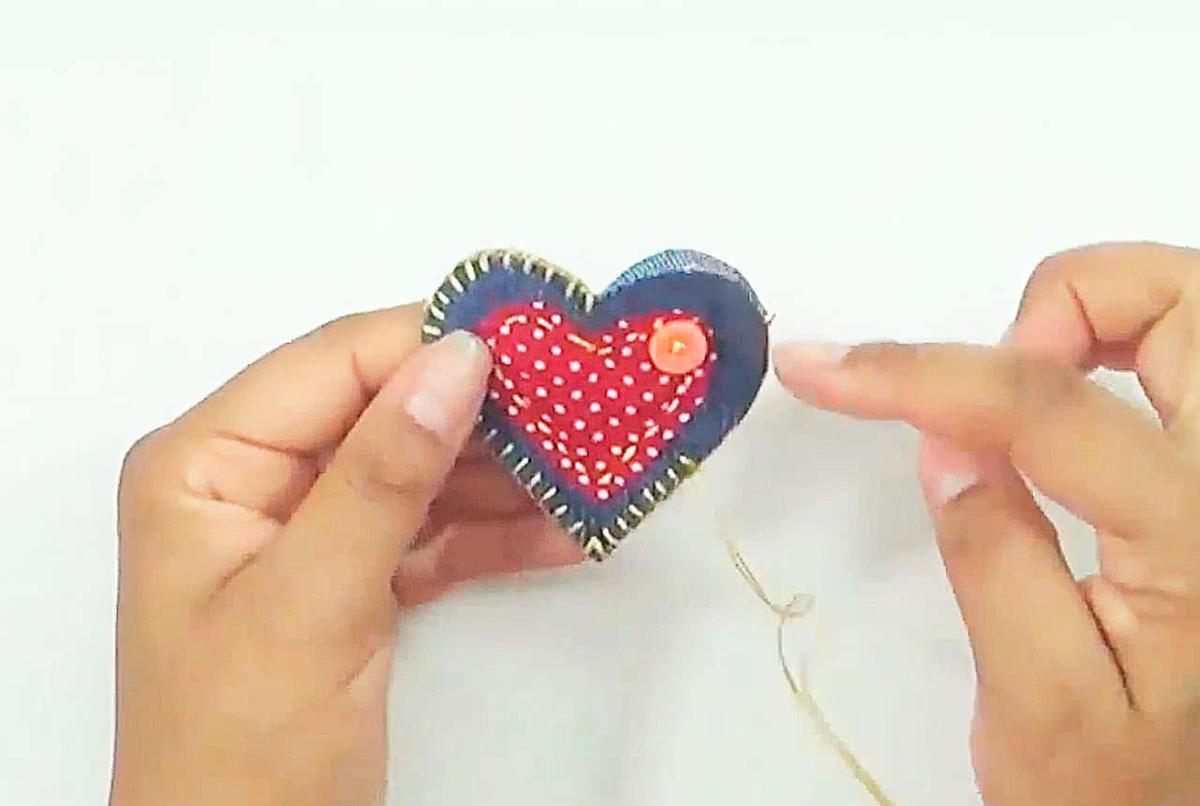 Coser el corazón pequeño sobre uno de los corazones de jeans, añadir la decoración que quieras, en mi caso añadí un botón, pero puedes poner un lazo, un corazón de fieltro, una flor, etc.