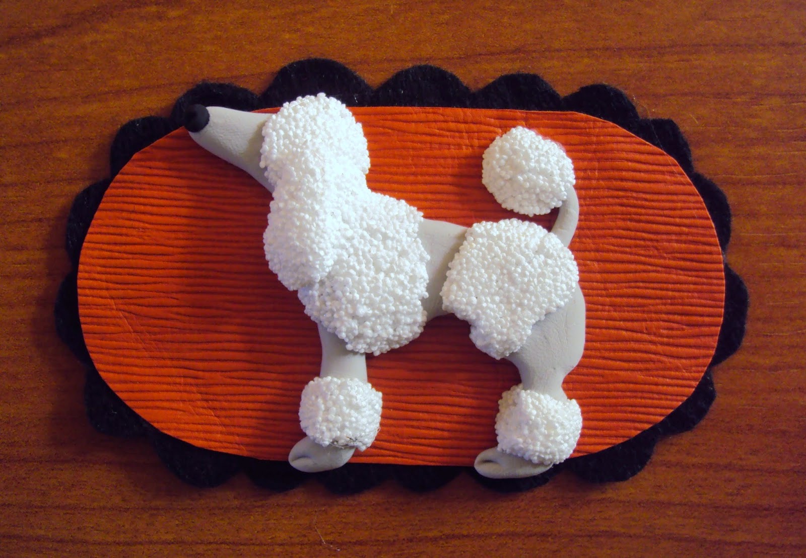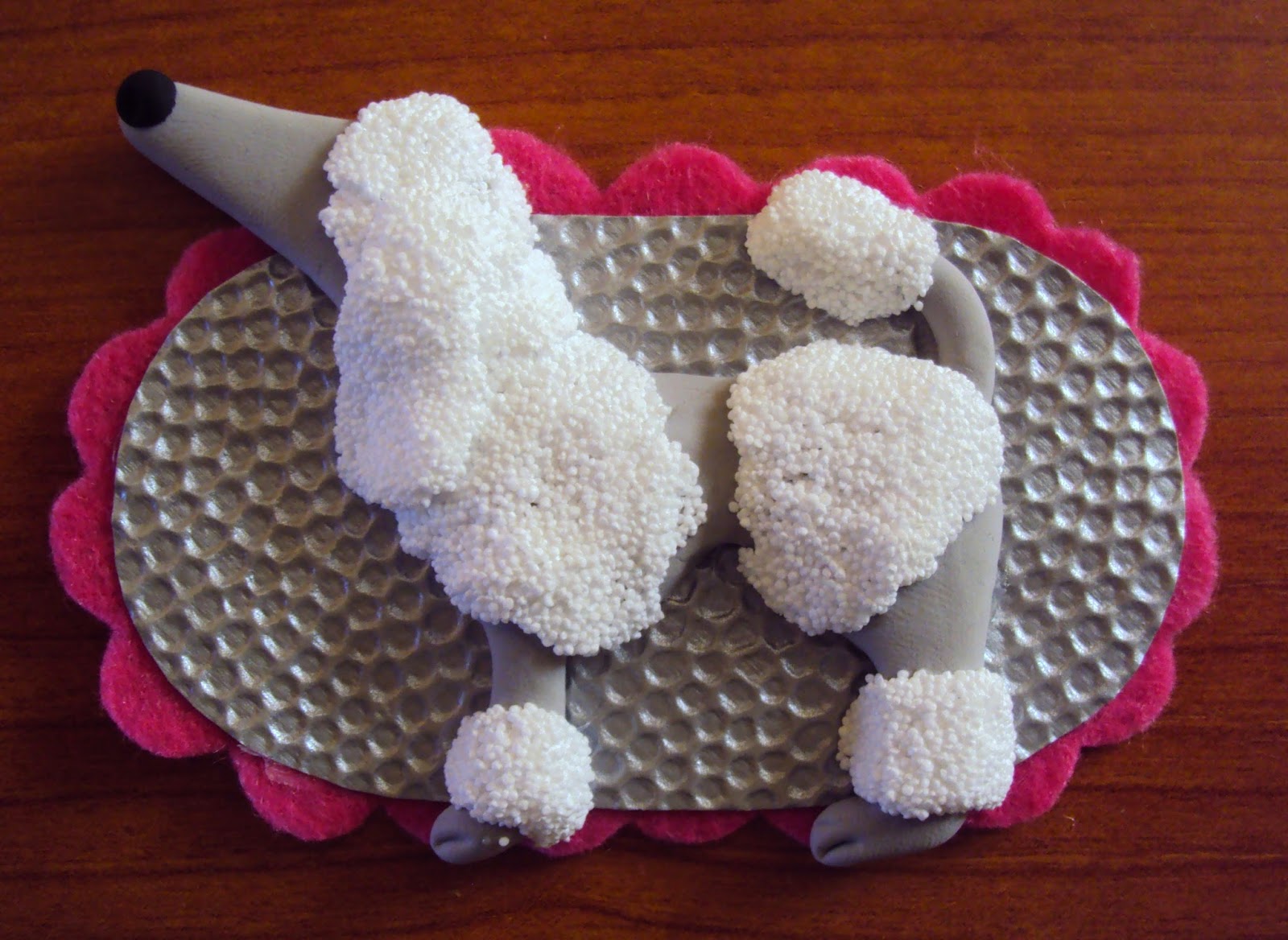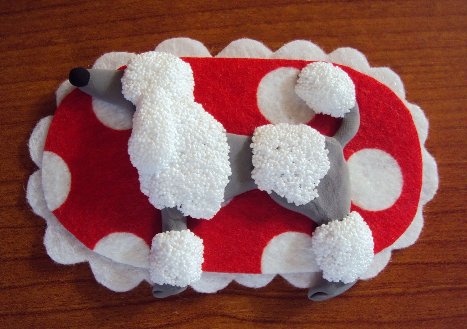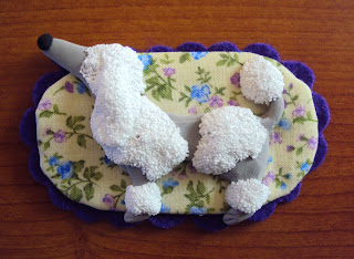 Moldeo nº 6, por último un caniche obediente con una tela estampada de flores y fieltro morado.