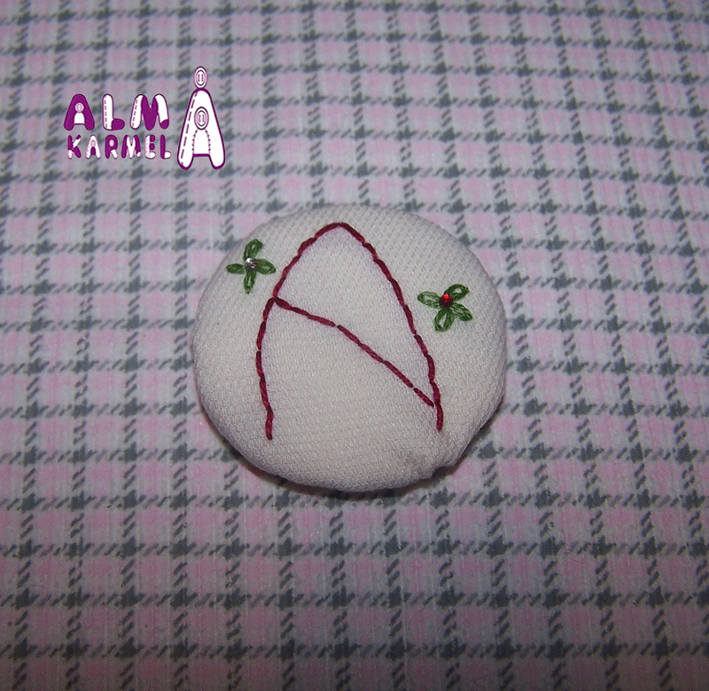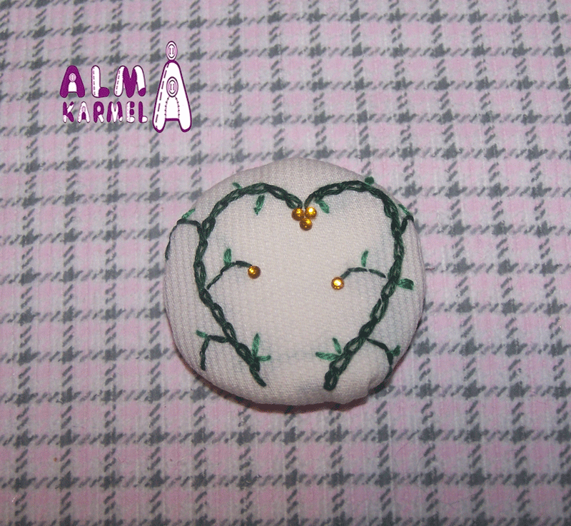 Son broches redondos en varios tamaños, forrados en tela de color crema y con bordados de motivos florales.