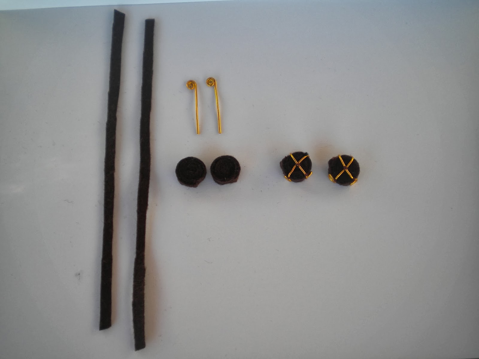 Fieltros de color rosado o color carneUnos trocitos de fieltro negro y rojo para los ojos y la bocaHilos de colores (Negro, marón, rojo y naranja)Lentejuelas y perlitas para los pendientesRelleno de almohados Chapa de Latón para las peinetasAlambre de color oroTijeras y alicates