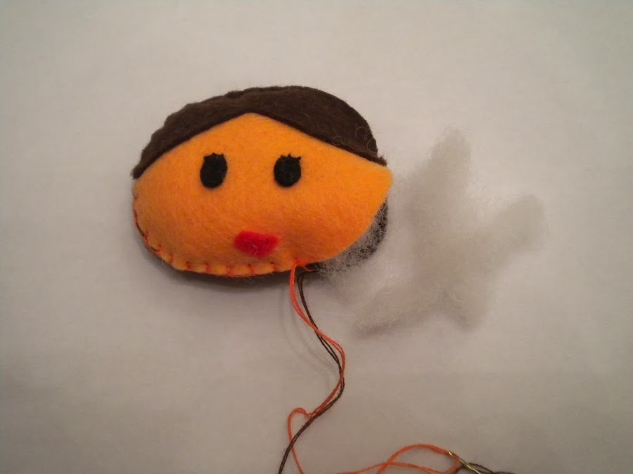 Cosemos el pelo a la cara y después unimos las dos partes una con el color marrón la del pelo y la cara parte de la cara con naranja. Una vez cosidos la mayor parte de la sirueta de la cara introducimos relleno.