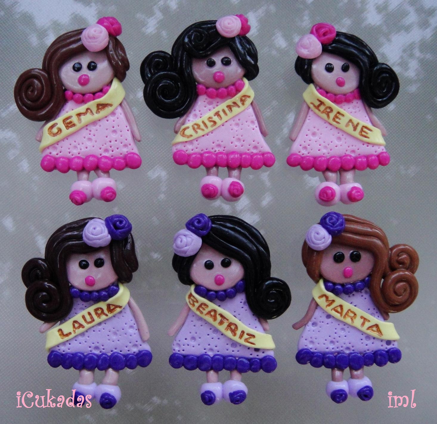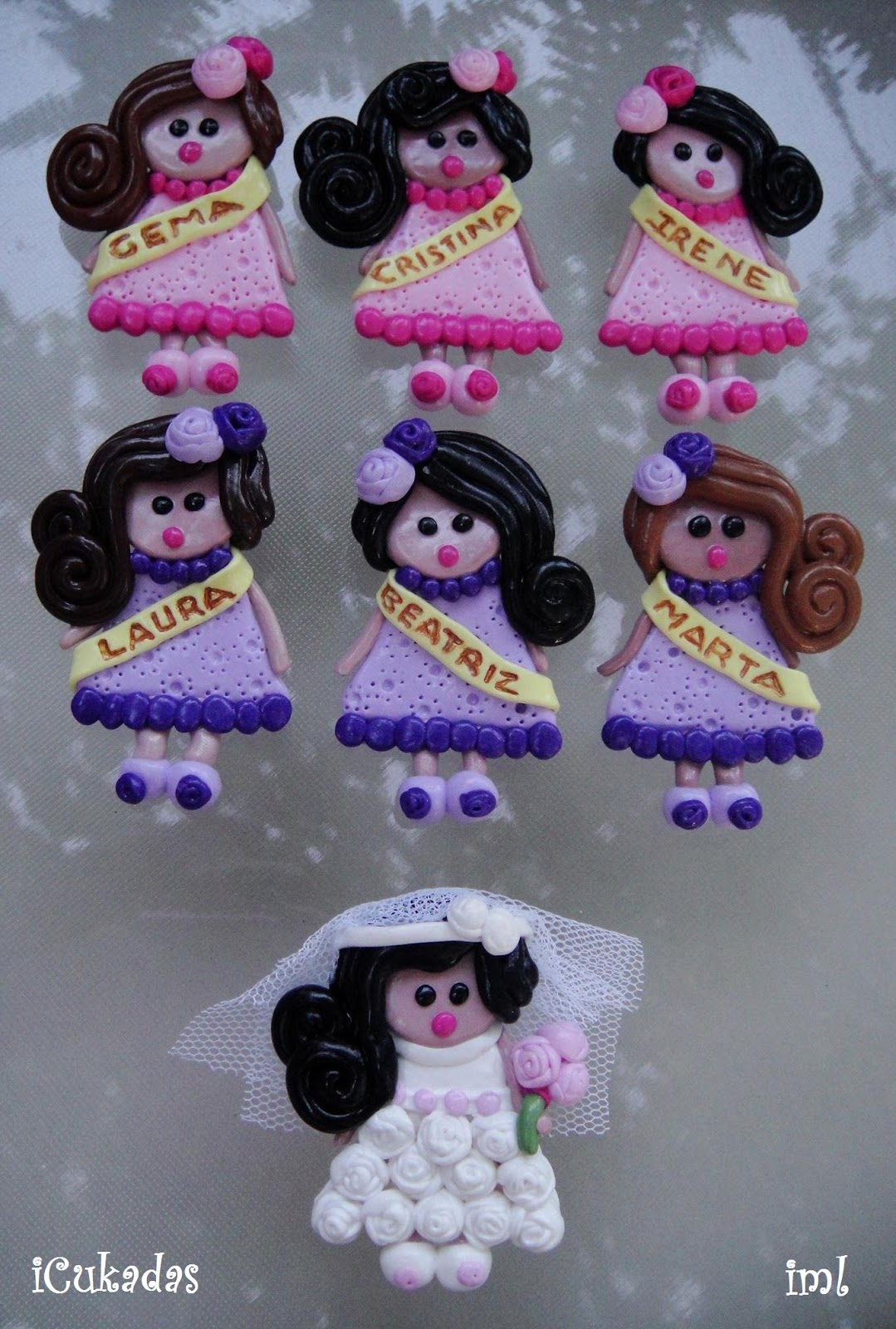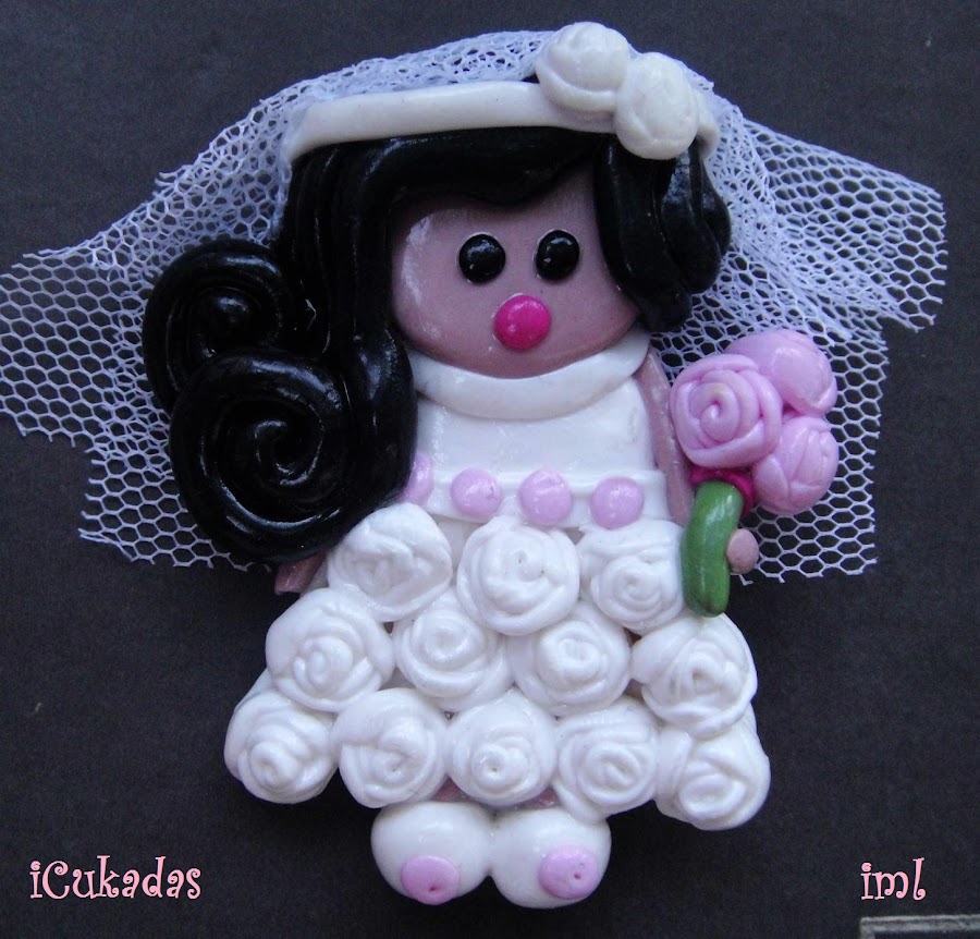 Se casaba una amiga de mi hermana, y era la encargada de organizarle la despedida de soltera, no encontraba unos broches identificativos que le gustaran y se nos ocurrió esta idea, asique me lié con el fimo................y a hornear!!. Hice a la novia, con velo incluido, y a las asistentes a la despedida personalizadas y como si fueran sus damas de hornor, y aqui está el resultado. Gustó a todas, y se pudieron llevar un recuerdo de la fiesta. Objetivo conseguido!