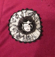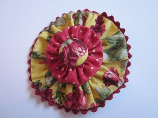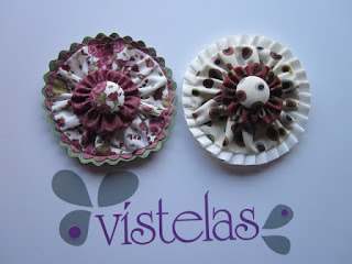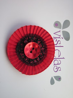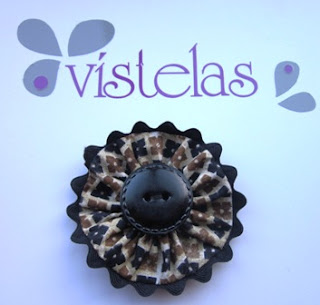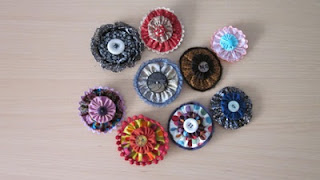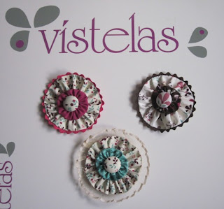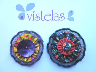 Para combinar nuestras camisetas, también he creado estos broches de tela, combinaciones de las últimas tendencias en patchwork, con moldes yo-yo, exquisitos botones y remates con volantes y zig-zag.