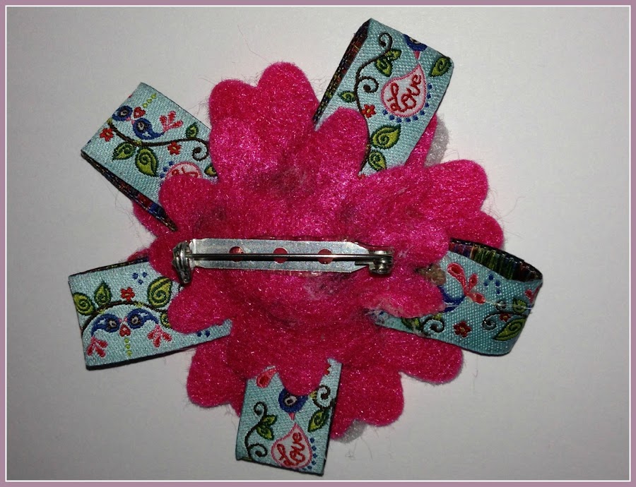 El broche está hecho a base de flores pegadas con silicona, y por detrás lleva una cinta de pajaritos y flores.