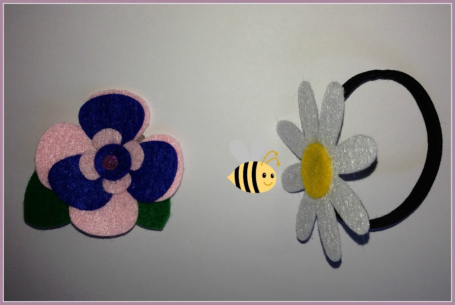 Primero he hecho un broche y un coletero, los dos con fieltro únicamente (salvo el centro del broche, que es un abalorio). Están pegados con la pistola de silicona, y han sido tan rápidos que lo más difícil ha sido escoger los colores.