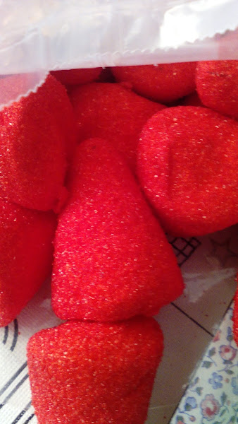 Luego elegimos las "chuches" yo coji unos fresones grandes que huelen de maravilla y están buenísimos y unas gominolas de fresa y tiras ácidas de manzana.