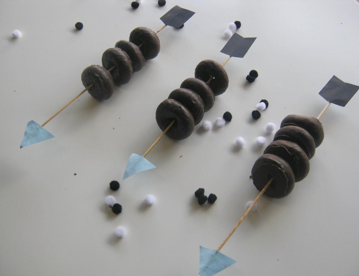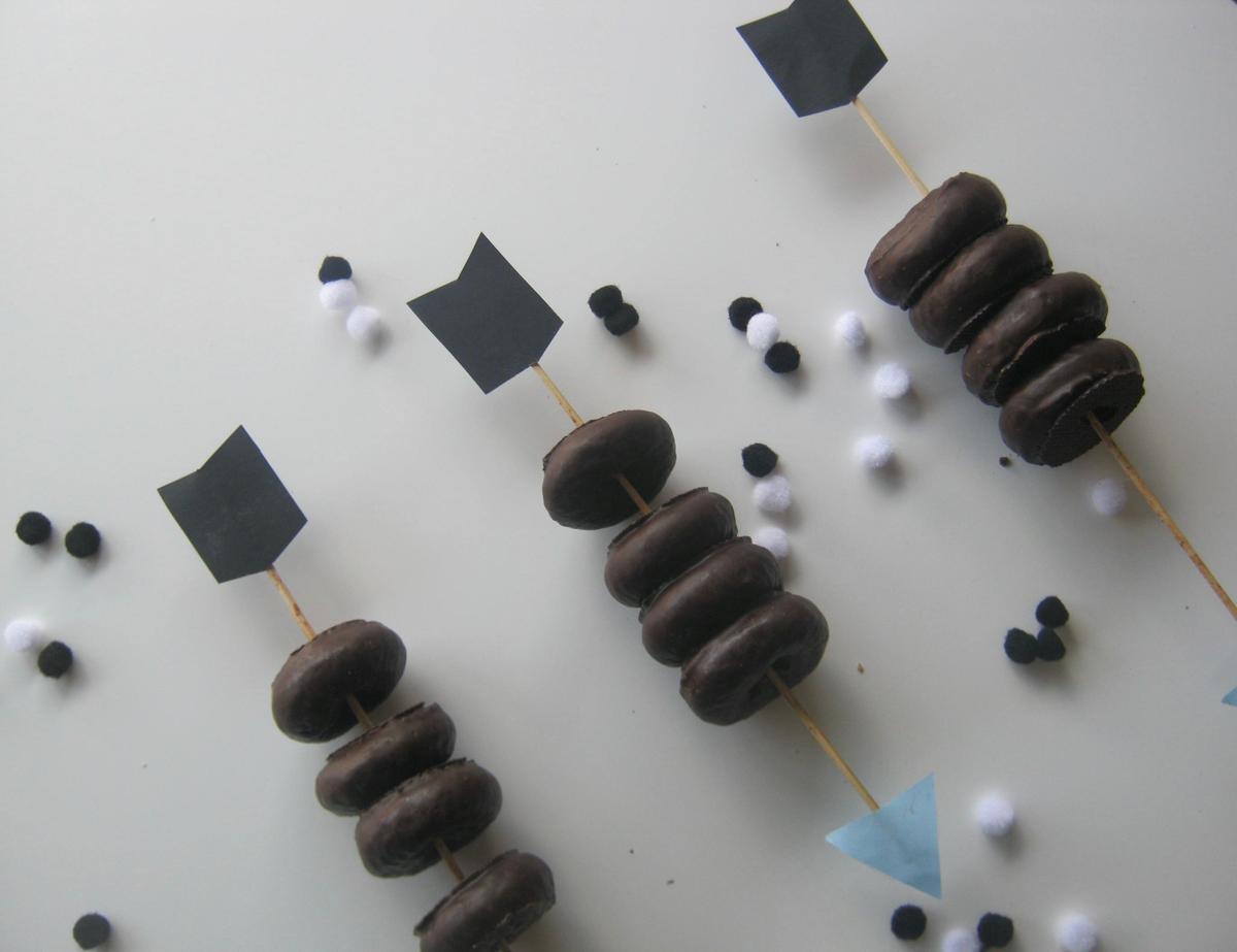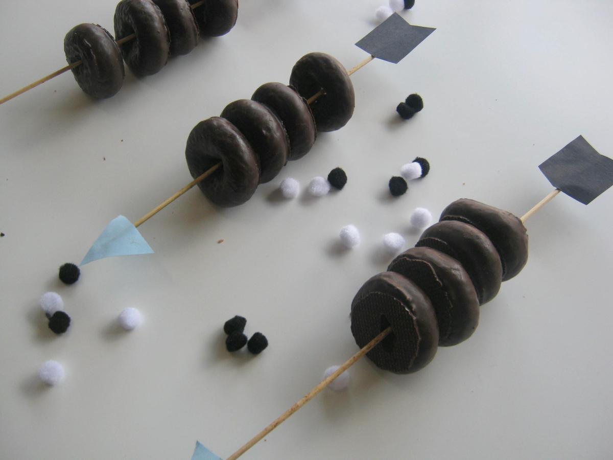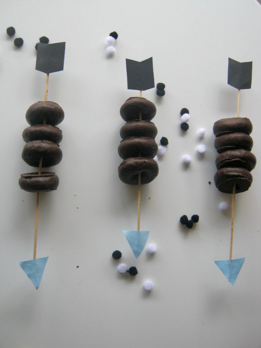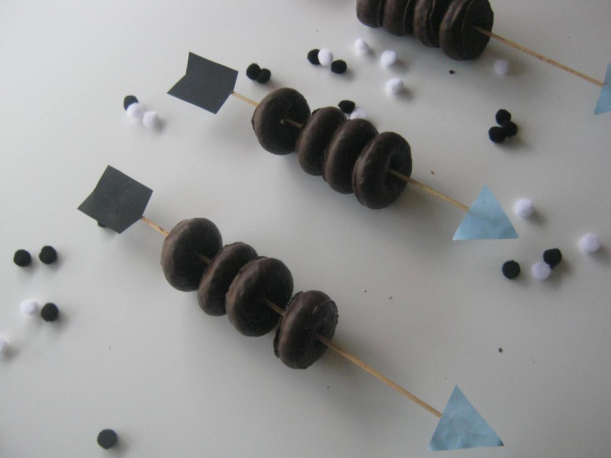 Sólo debéis comprar las donuts pequeñas (de vuestra sabor favorito) y hacer brochetas con ellas decoradas de flechas.