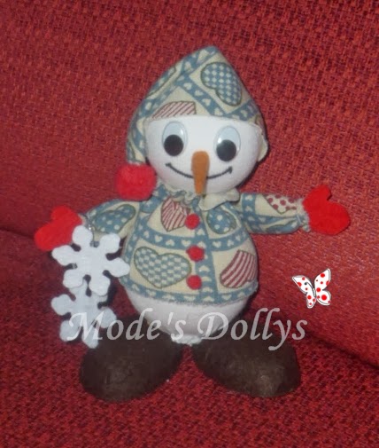 Este es Frosty, está hecho con dos bolas de porexpán, igual que los pies (un huevo de porexpán partido por la mitad), tela y fieltro. Sencillo y gracioso, da la bienvenida al frío.