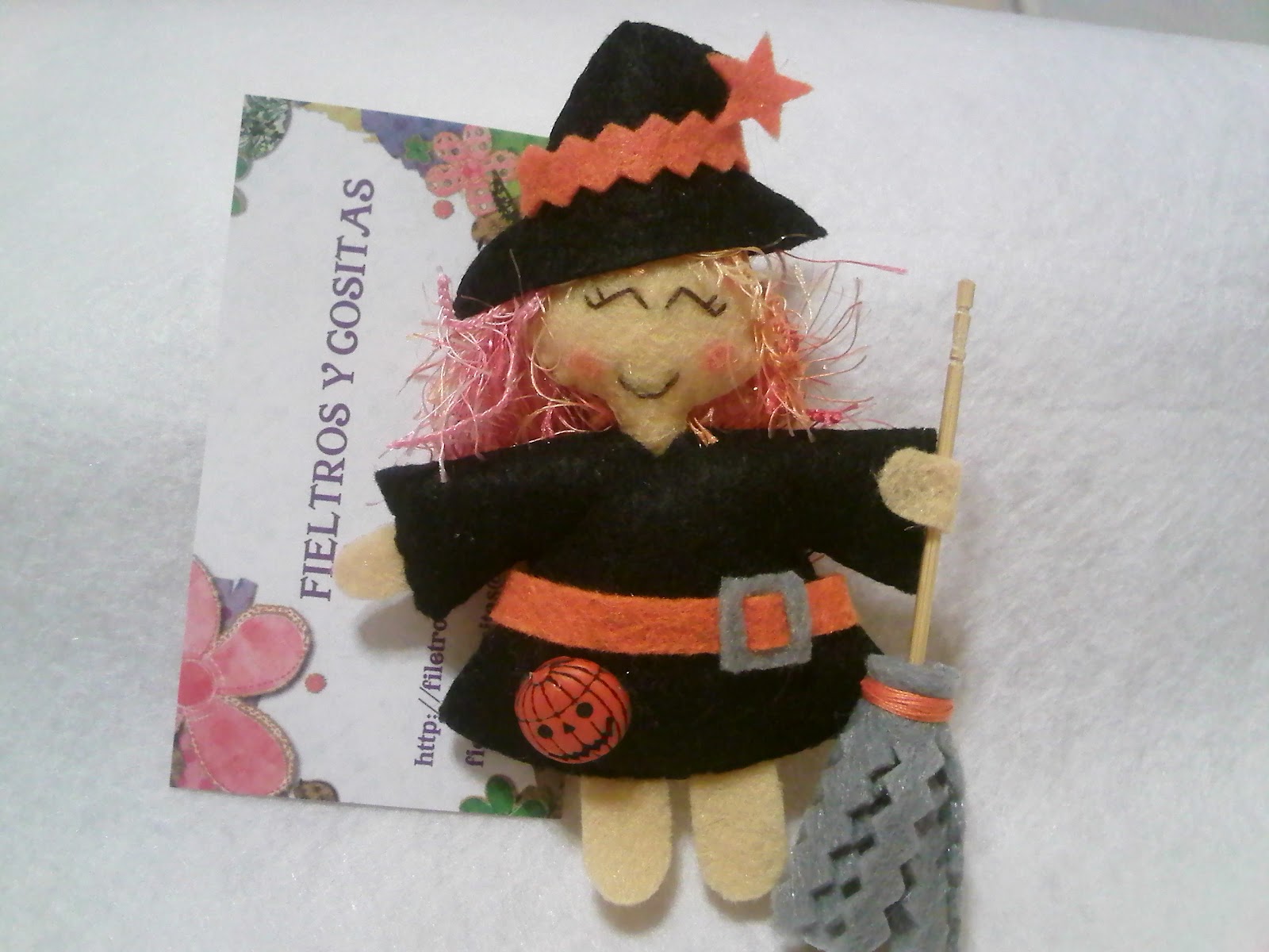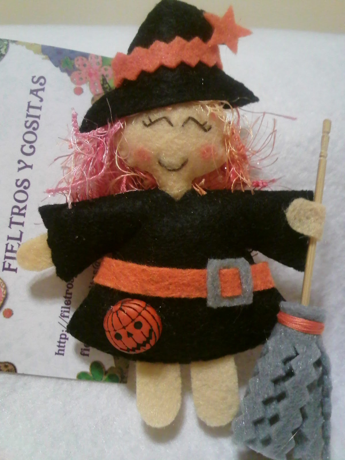 Esta bruja de fieltro tan cuqui ya esta lista para el "Truco o Trato de Halloween "seguro que consigue un montón de caramelillos...