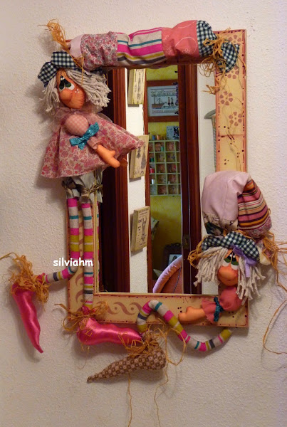 Un nuevo espejo con brujas "buenas", uno de mis trabajos favoritos. Es un espejo grande, 60x40 cm.,pintado en color mantequilla y con flotado en rosa. Decorado con plantillas de stencil y con un borde a modo de pespuntes. Las muñecas son las dos iguales, pero una de cuerpo entero y la otra "agarrada" al espejo con su mano y una pierna .Esta muñeca la empezaremos a hacer en los cursos. Además, estaremos también con nuestros cursos en una nueva tienda: La mercería "CLAIR SOLEIL" especializada en labores , en la calle El Greco, nº 18. Allí encontraréis un gran surtido en cintas, cordones, material para punto de cruz, bolillos..., de lo más surtido en Salamanca y Diana os atenderá estupendamente.