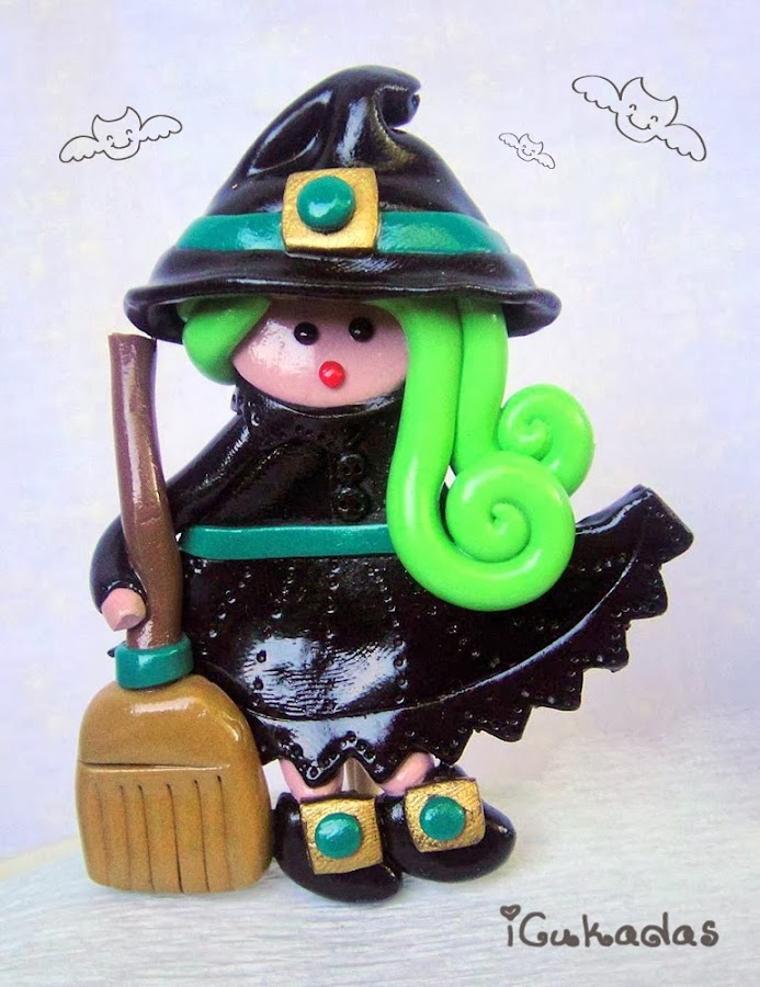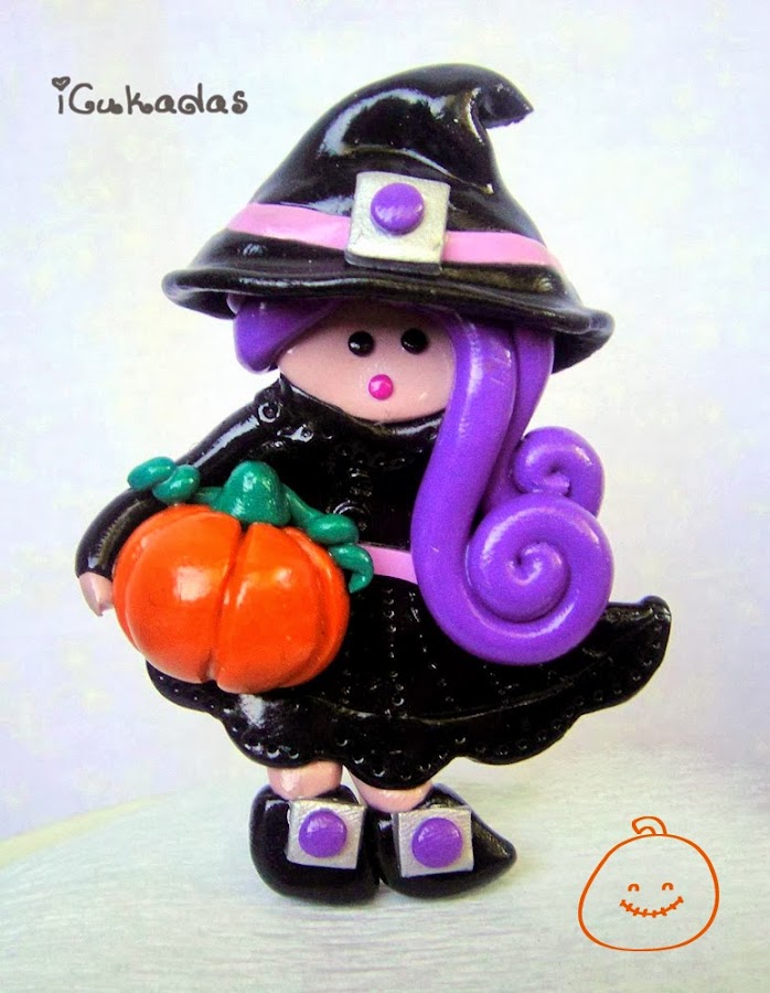 Por eso, aunque sea un pequeño detalle tenía que hacer, y decidí disfrazar a las Cukas de brujitas, con escoba y todo, no quedan muy tétricas pero cumplen con los requisitos de la fiesta, colores negro, morado y naranja, escobas, calabazas, gatos negros y .............son brujas.