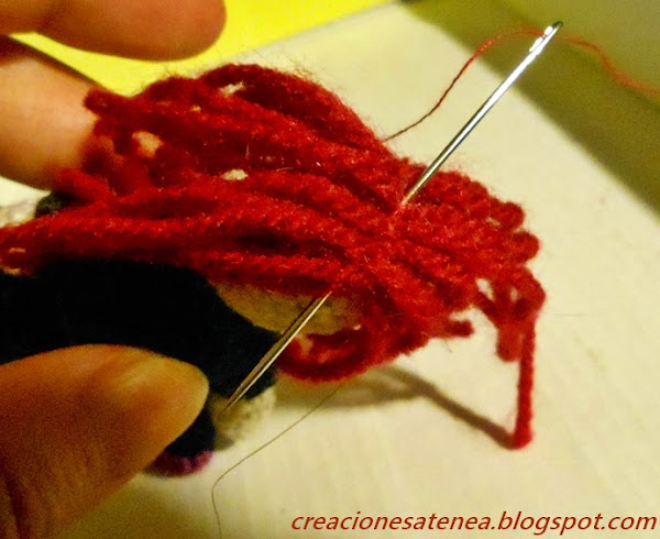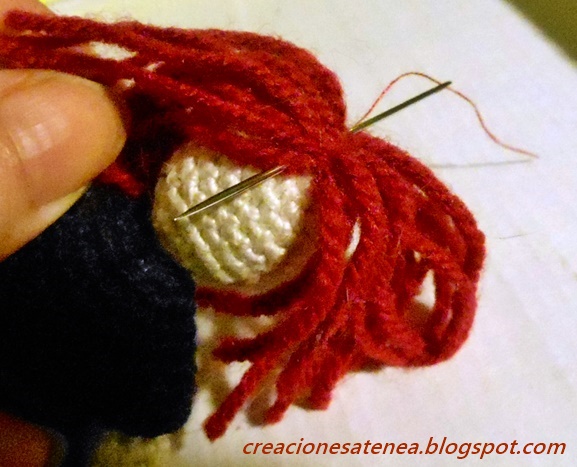 Luego cosí a la cabeza de la brujilla ambos trozos de lana cosida para formar la melena y la recorté para que quedara a la longitud deseada y por igual.