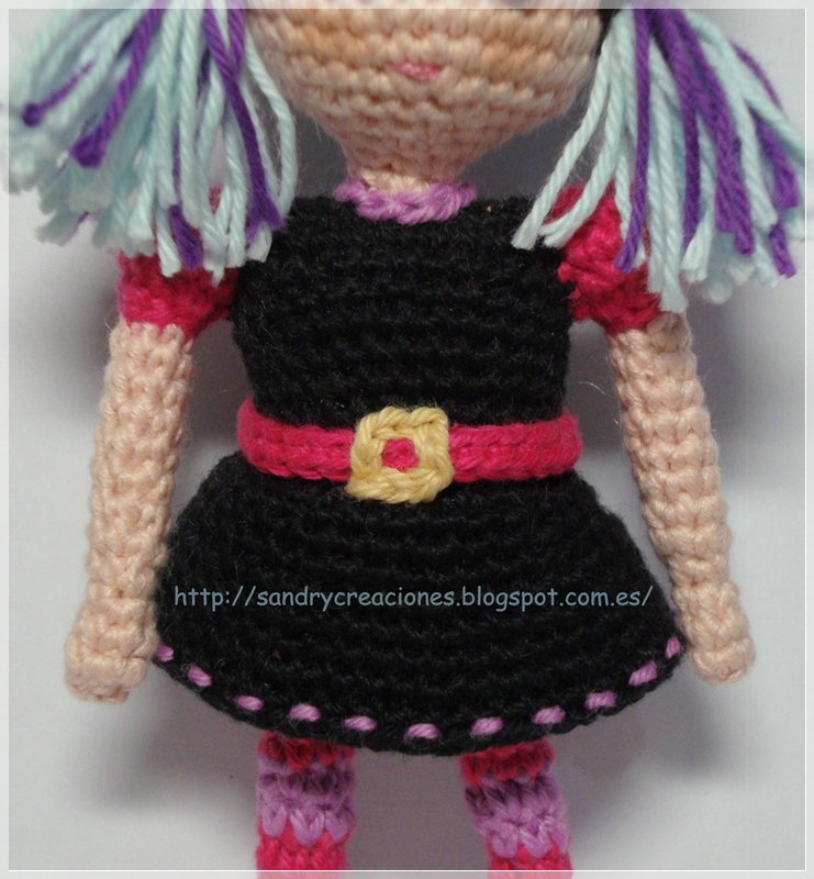 Siguiendo por el vestido vi que algunas lo llevaban largo, otras corto; que en unas eran dos piezas, es decir, blusa y falda y en otras vestido completo pero la mayoría eran de color negro. Así que en mi caso opté por hacerle un vestido negro con falda corta, con mangas cortas de color rosa fucsia y un cinturón rosa fucsia a conjunto con las mangas. Así mismo quise rematar el vestido añadiéndole en la parte inferior de la falda el detalle de un pespunte de color lila a juego con el lila de las medias y realizando un punto de cadeneta del mismo color alrededor del cuello para darle un buen acabado.