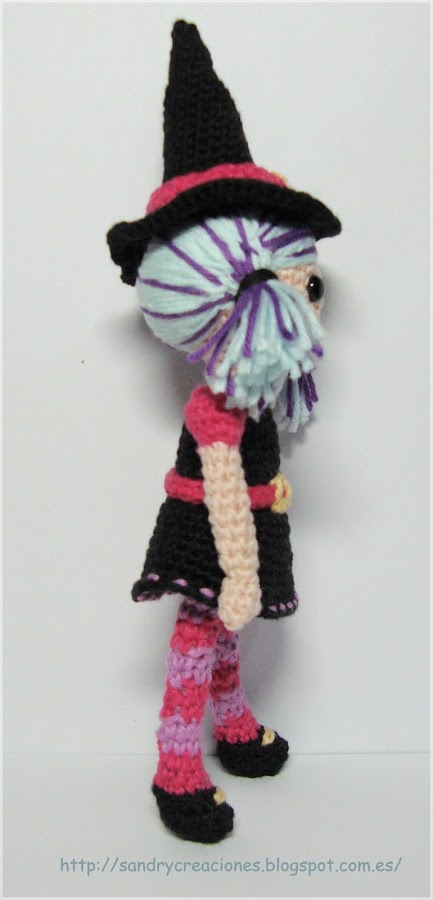 Y aquí os muestro un poco los pasos que fui realizando para confeccionar mi brujita y de la que más adelante, cuando lo haya pasado a limpio, os prometo compartir el patrón, ya que se me quedaba corto el tiempo para poder indicarlo bien :)