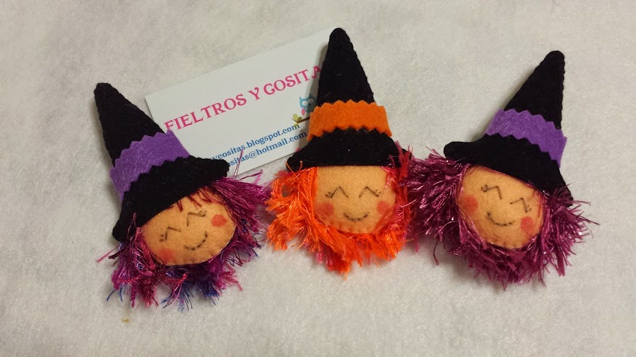 Se va aproximando Halloween y los primeros pedidos ya están listos para viajar a sus destinos...hoy le ha tocado el turno a las brujitas de fieltro..... las dos primeras viajarán a Galicia a finales de semana y las caritas son para el mercado de Jueves 9 que tendremos en Alicante, en la Hoguera de los Angeles....