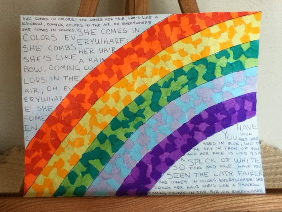 Como no contaba con esos papeles hermosos tipo scapbook tuve que improvisar con hojas de color. Hice un arcoiris y para completar el tema escribí la letra de la canción "She´s a rainbow" de The Rolling Stones...que por cierto me gusta muuucho.