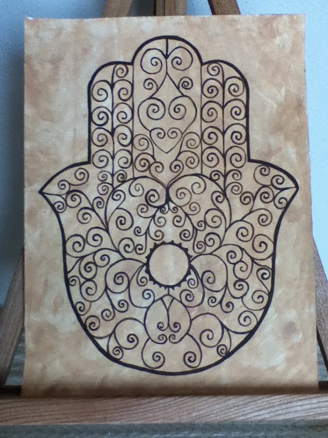 Seguimos con el zentangle. Sobre un fondo que había hecho anteriormente dibujé un jamsa que es una imagen que se utiliza en amuletos hindúes para el mal de ojo principalmente aunque la razón por la que hice este diseño es porque mi hemana me regaló el libro La mano de Fátima que así es como se le conoce también a esta imagen.