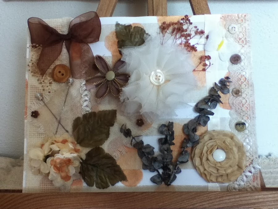 Para este ocupé el fondo y las flores que hice en tutoriales anteriores, naturaleza muerta, listones, encajes, botones, tiras bordadas, flores de tela y...y creo que nada mas jejeje.