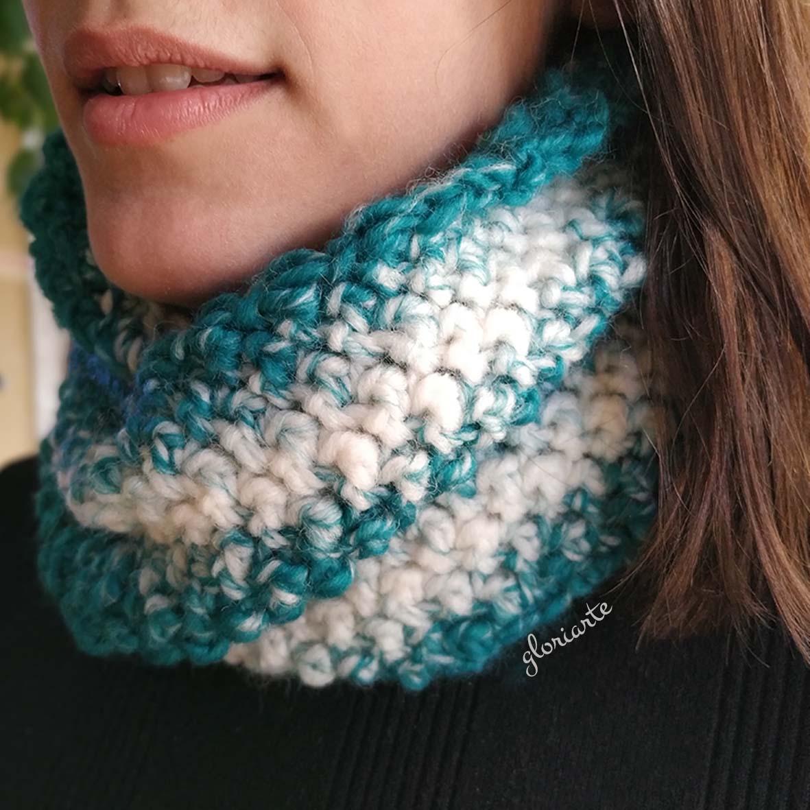 Muy rápido de tejer, sólo vamos a necesitar un ratito para disfrutar crocheteando y presumir de cuello nuevo handmade. Además con este ovillo en degradé queda precioso, ¿Lo quieres igual? Te cuento todos los detalles a continuación: