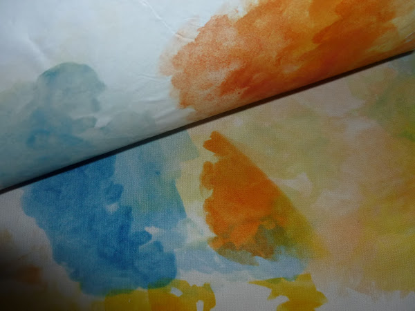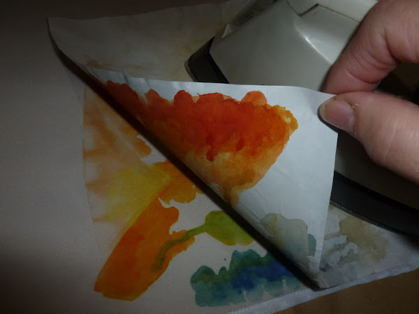 Extendemos la bufanda de gasa, debajo ponemos un papel por que la tela es muy fina y puede pasar la pintura y manchar el papel, colocamos los papeles pintados y planchamos.