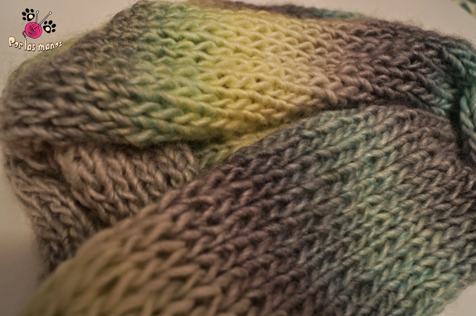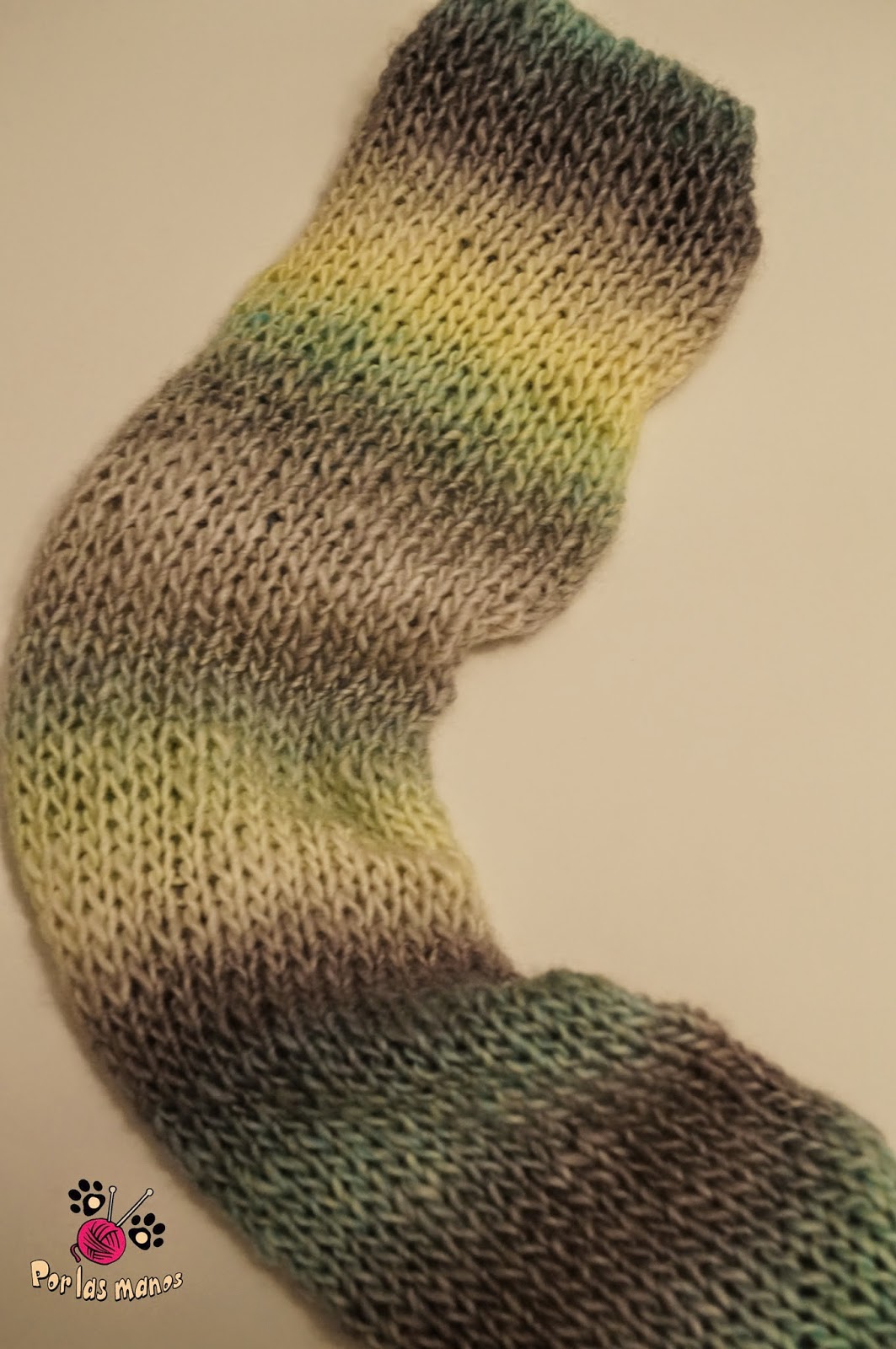 La bufanda está unida en los dos extremos, porque me gustan mucho las que se enrollan en el cuello, porque son más cómodas. Y los colores me encantan, porque es como un difuminado gris, verde, amarillo que queda muy bonito.