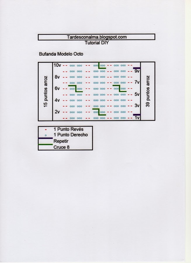 39 puntos a punto de arroz ( en este lado pondremos los botones), 2 puntos a punto revés, 6 puntos a punto jersey (será el primer ocho), 2 puntos del revés, 6 puntos a punto jersey (será el segundo ocho), 2 putos revés, 6 puntos a punto jersey (será el tercer ocho), 2 puntos revés, 15 puntos a punto arroz (en este lado irán los ojales). Tejer así las vueltas impares. Las vueltas pares se tejerán como se presentan.