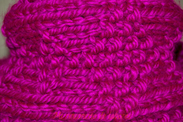 Bufanda infinita tejida con 2 ovillos Caricia Veleta color rosa y agujas del número 8.