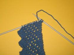 8ª vuelta: Ahora tenemos dieciseis puntos en la aguja, se cierran los cuatro primeros y se tejen los otros doce del derecho. Con esta vuelta habremos terminado un pico de la puntilla y tendremos doce puntos en la aguja que seguiremos tejiendo empezando de nuevo por la primera vuelta.
