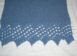 Sujetamos la puntilla al extremo de la bufanda con alfileres y cosemos con una hebra de lana del mismo color.