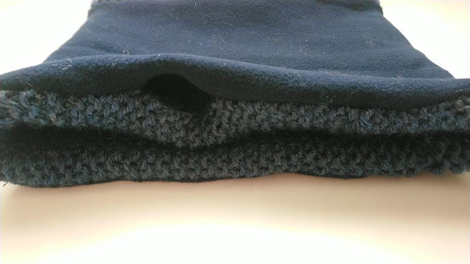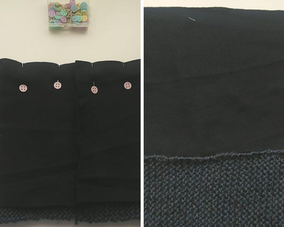 Ahora, cortamos el retal de tela polar con unos 4 cm más de ancho que la bufanda de lana, y de largo unos 4 cm menos, y lo cosemos a la bufanda de lana, por la cara en la que la costura es visible, es decir, no en el lado bueno: