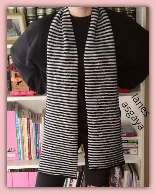 Impresionante el patrón de esta bufanda. Una locura para los seguidores de Harry Potter: parece una bufanda normal de rayas y, según el ángulo en el que la mires, aparece la Marca Tenebrosa, símbolo de Voldemort por un lado y el encantamiento Morsmordre por otro