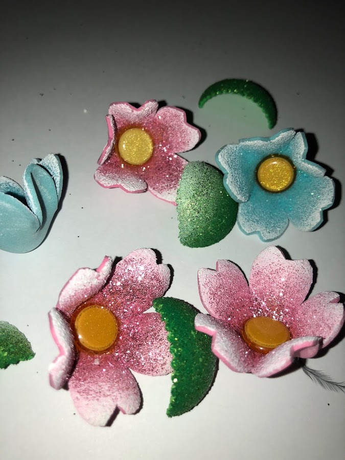 5. Elaboramos florecitas en microporoso escarchado celeste y rosa y formamos florecitas termoformadas, así mismo lo hacemos con las hojitas. Para formar el centro de la flor utilizamos botones.